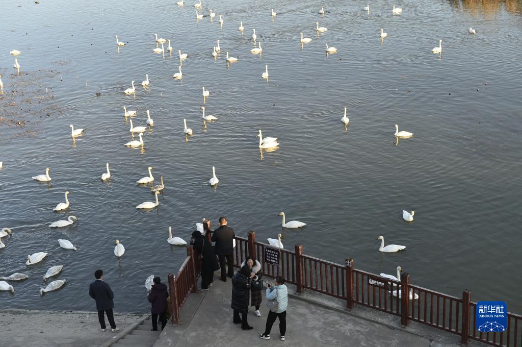 12月1日,游人在三門峽市天鵝湖國家城市濕地公園觀賞天鵝。