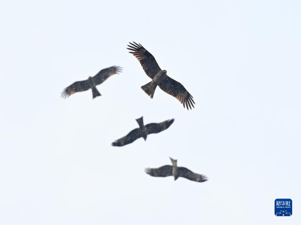 12月2日,幾只黑鳶在福建省三明市泰寧縣大金湖上空飛翔。