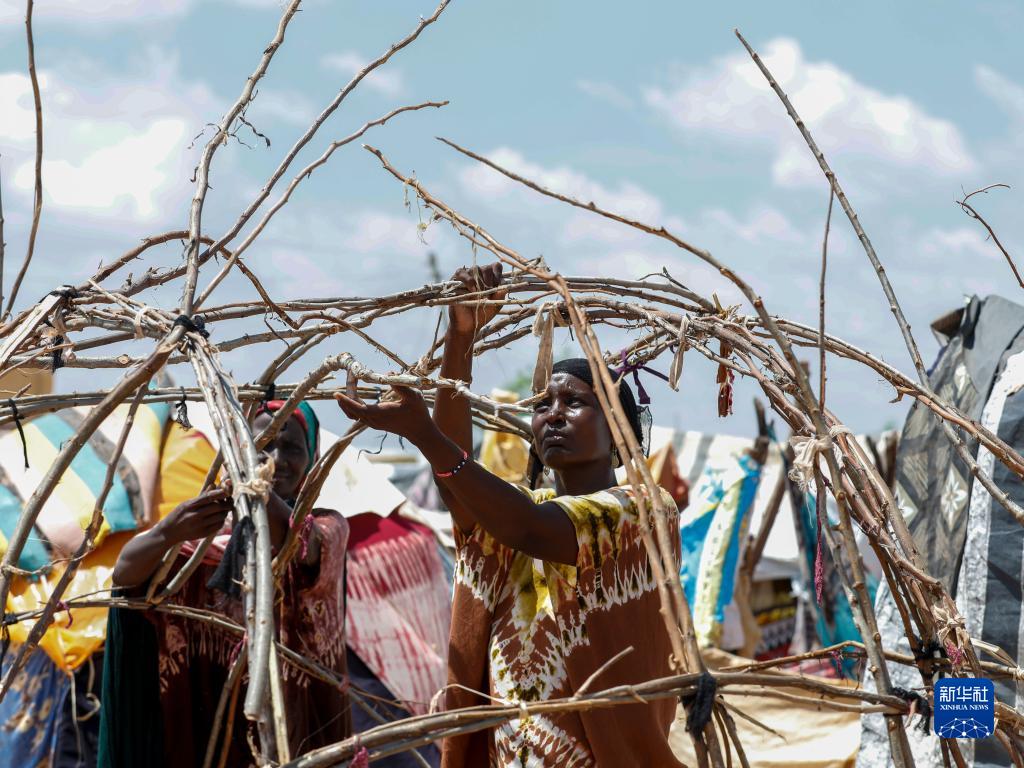 12月1日,在肯尼亞塔納河郡的一處臨時安置點,幾名婦女在搭建帳篷。