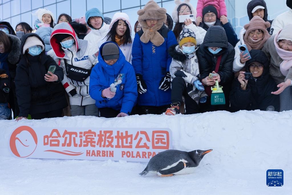 時值周末,哈爾濱極地公園的企鵝亮相戶外,上演冰雪巡游,吸引許多游客前來觀賞。目前正是黑龍江省哈爾濱市的冰雪旅游季。