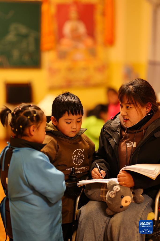 卓嘎(右)在給藏文書法小學員講授書寫要點(12月1日攝)。