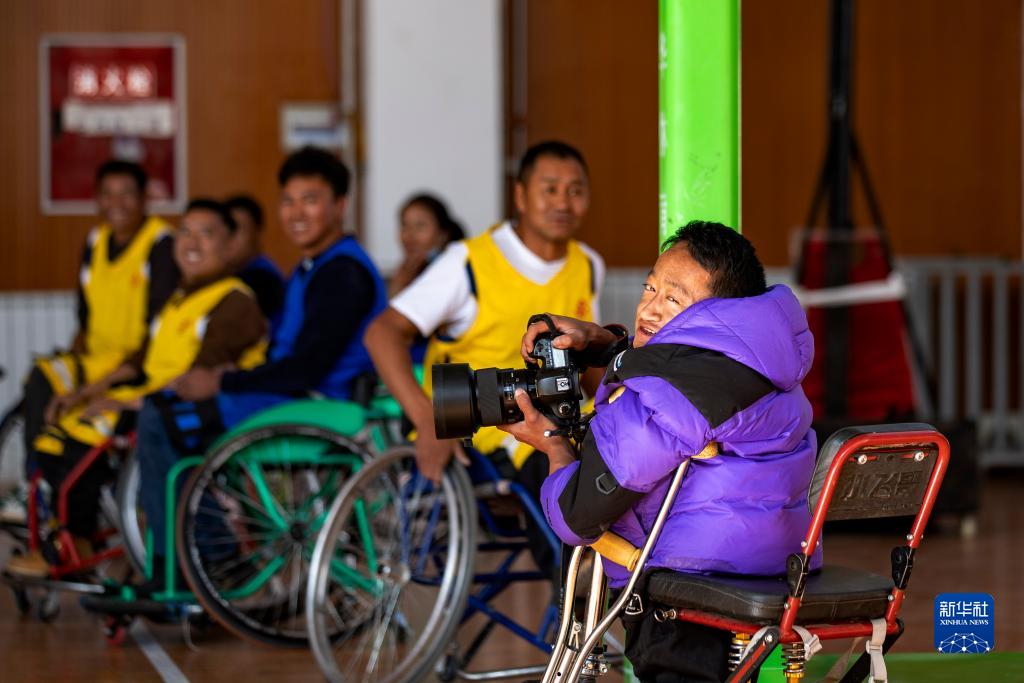 拉巴頓珠(右一)在拍攝輪椅籃球訓練(11月26日攝)。