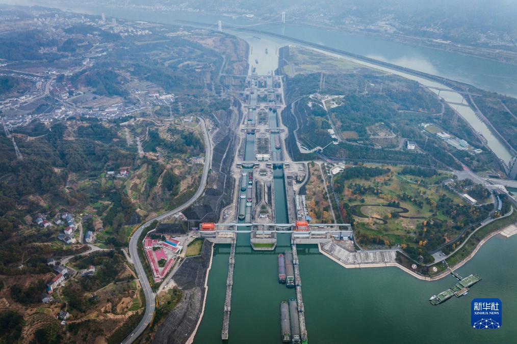 12月1日,船舶有序通過三峽雙線五級船閘(無人機照片)。截至11月25日,三峽船閘2023年過閘貨運量超1.56億噸,突破2022年全年貨運量歷史最高紀錄。今年以來,三峽船閘共運行10210閘次,過船39463艘次,通過旅客16939人次。自2003年通航以來,三峽船閘已安全高效運行20年,累計過閘貨運量19.96億噸。