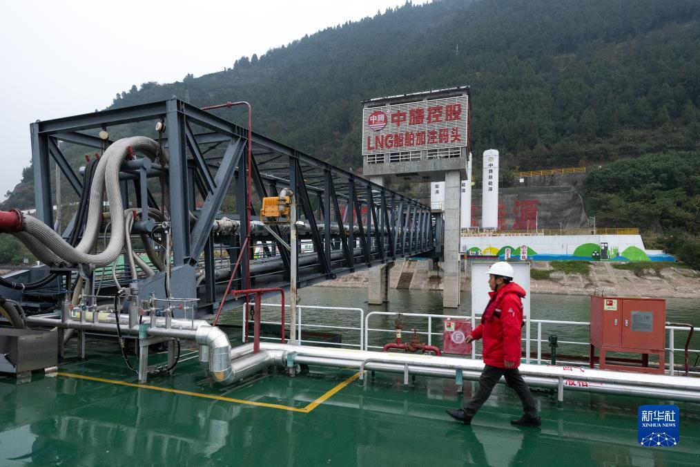這是11月30日拍攝的位于湖北宜昌市的中旖新能源LNG加注站碼頭。該項目是交通運輸部水運行業應用液化天然氣試點示范項目,主要為過往船舶加注LNG液化天然氣及提供水上服務,從而有效降低船舶碳排放以及能源運輸成本。