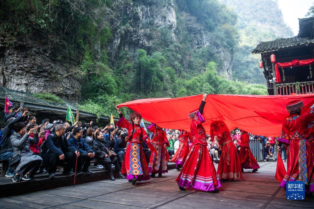 12月2日,在湖北宜昌市夷陵區三峽人家風景區,演藝人員在為游客進行民俗表演。宜昌5A級旅游景區三峽人家依山傍水、風景如畫,它以“一肩挑兩壩、一江攜兩溪”的獨特地理位置,每年吸引著上百萬游人。