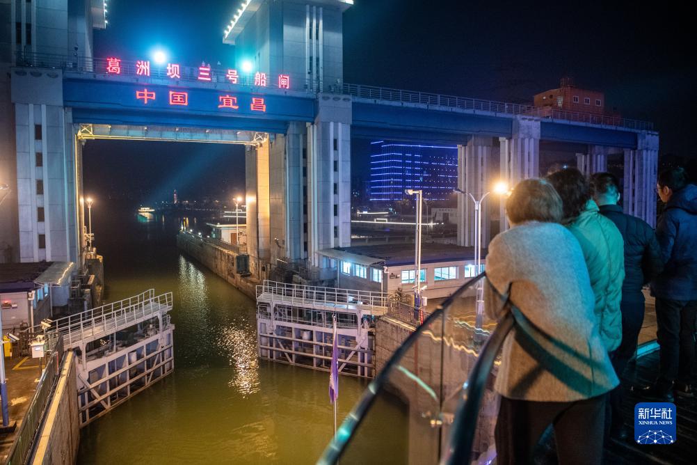 游客乘坐純電游輪“長江三峽1”號通過葛洲壩三號船閘(12月1日攝)。近年來,湖北宜昌市“長江夜游”將城市景觀、水電文化、三峽特色和夜間休閑深度融合,現已成為宜昌旅游的一張亮麗名片。