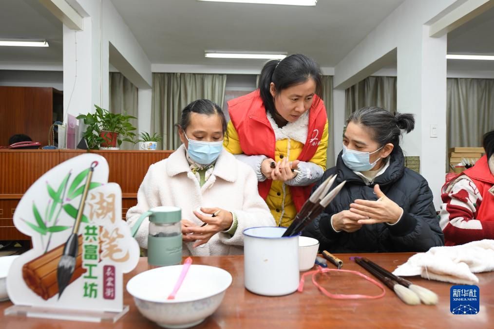 12月4日,在湖州市愛山街道衣裳街社區,一家湖筆企業的志愿者為轄區就業困難人員提供技能培訓。