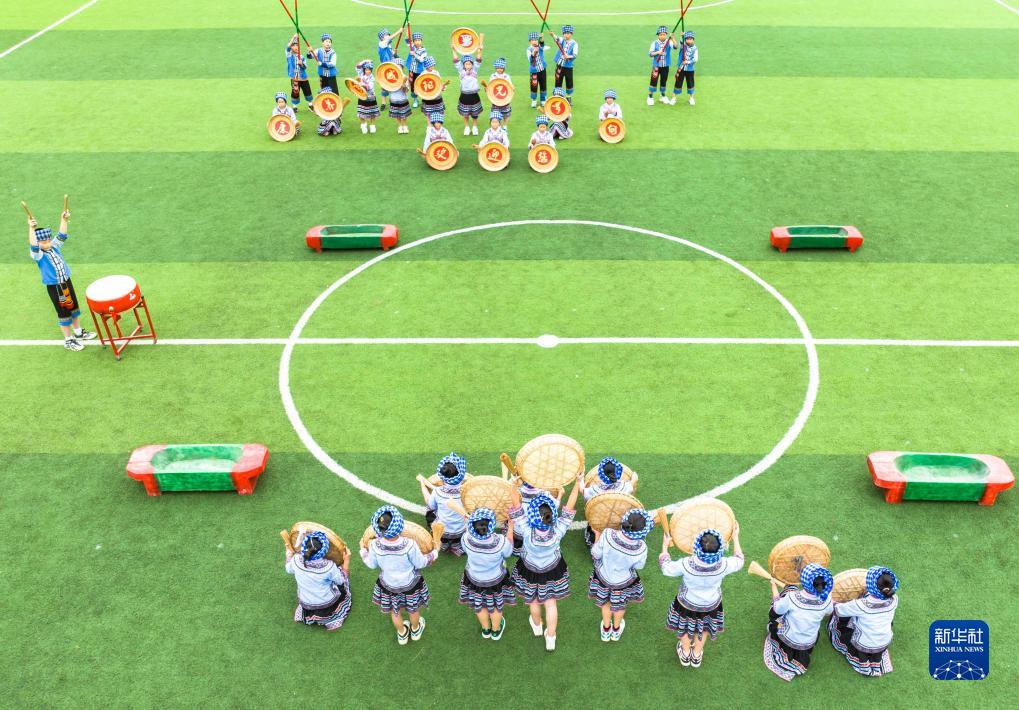 12月4日,學生在貴州省羅甸縣第二小學學跳布依族粑槽舞(無人機照片)。