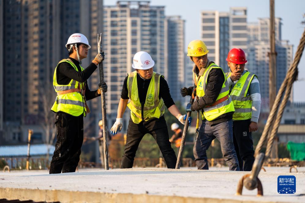 12月4日,工人在長沙萬家麗路快速化改造北延線工程施工現場進行橋面板安裝作業。