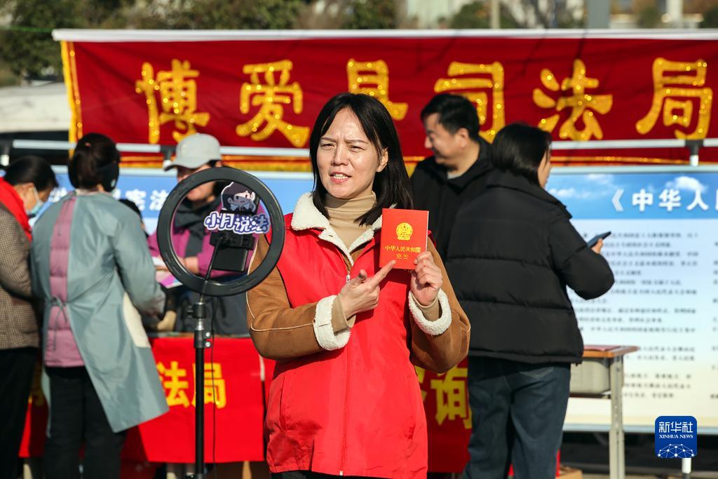 12月4日,在河南省焦作市博愛縣人民公園,博愛縣司法局月山司法所短視頻普法小欄目“小月說法”主持人通過網絡直播宣傳憲法。
