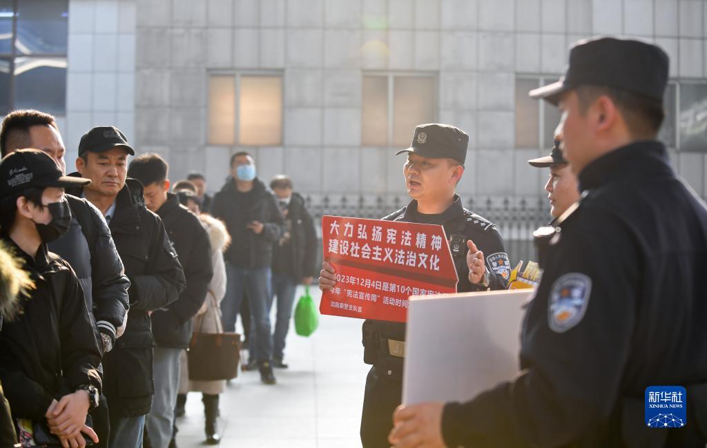12月4日,沈陽鐵路公安局沈陽公安處乘警支隊民警在沈陽北站向乘客宣傳憲法知識。