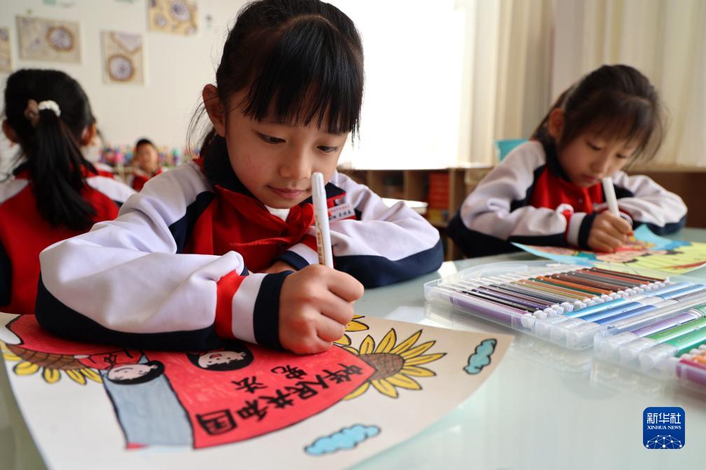 12月4日,山東省濱州市渤海中學小學部的學生在繪制以國家憲法日為主題的手抄報。