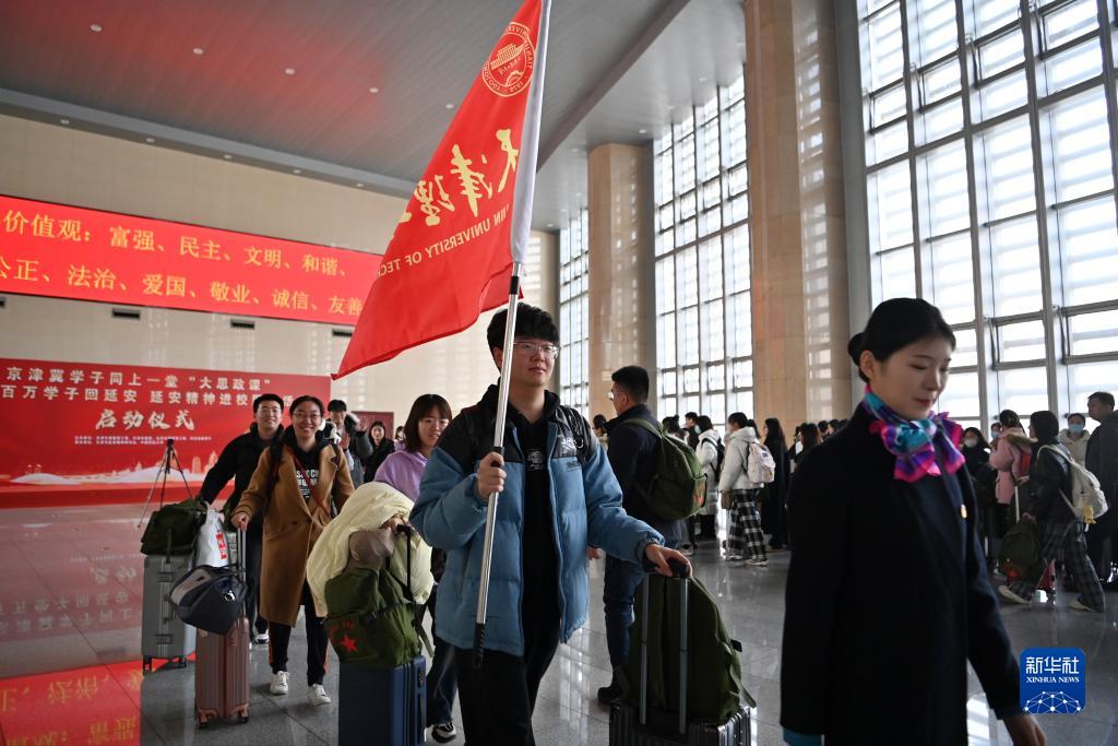 當日,京津冀學子同上一堂“大思政課”暨“百萬學子回延安 延安精神進校園”活動啟動儀式在天津火車站舉行。來自北京師范大學、南開大學、河北工業大學等13所高校的約300名師生,將赴延安開展為期一周的紅色研學實踐活動。