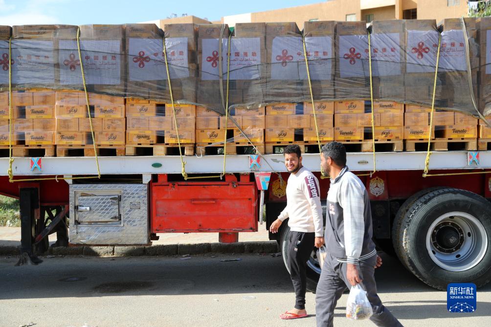 11月27日,在埃及開羅,中國向加沙地帶提供的人道主義物資裝車等待發運。