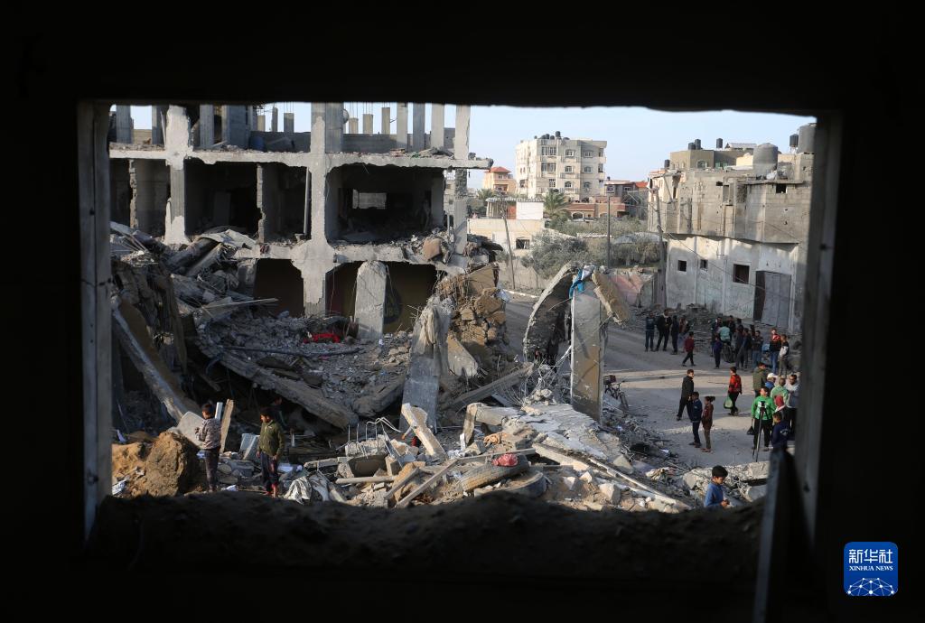 12月4日,在加沙地帶南部城市拉法,人們查看以軍空襲后的住宅廢墟。