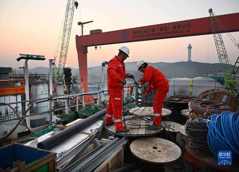 12月4日,工人在建造中的“海洋石油122”上進行電纜鋪設作業。