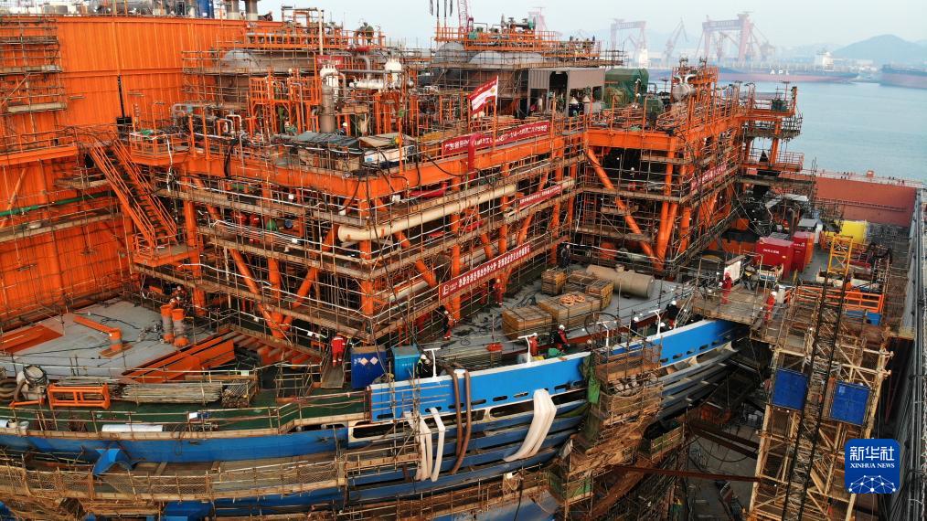 在海洋石油工程(青島)有限公司生產基地,工人對“海洋石油122”進行上部模塊總裝作業(12月4日攝,無人機照片)。