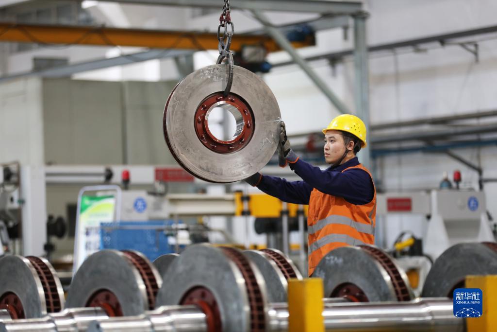 12月4日,工作人員在哈爾濱局集團公司齊齊哈爾車輛段輪軸車間吊裝客車車輪制動盤。