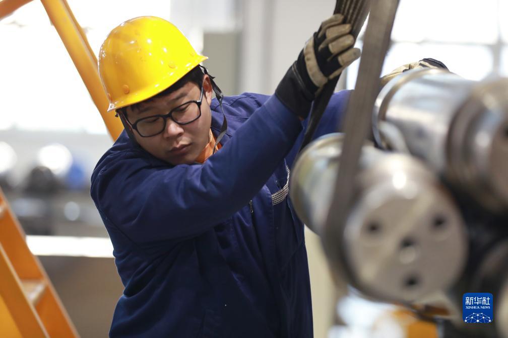 12月4日,工作人員在哈爾濱局集團公司齊齊哈爾車輛段輪軸車間進行吊裝作業,為車軸加工備料。