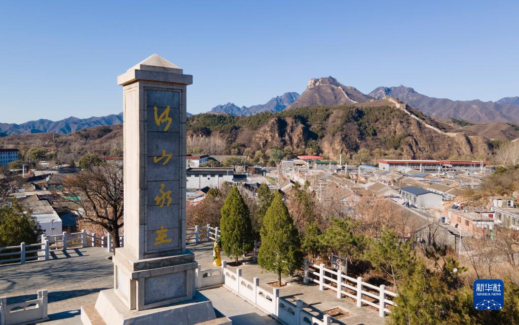 寫有“河山永在”的古北口保衛戰紀念碑屹立在古北口鎮(無人機照片,11月14日攝)。