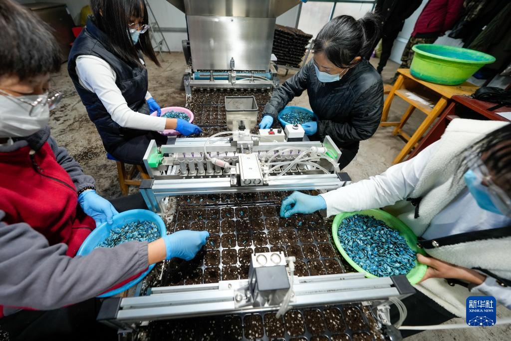 12月5日,河北省樂亭縣一家育苗基地的工人在進行播種作業。