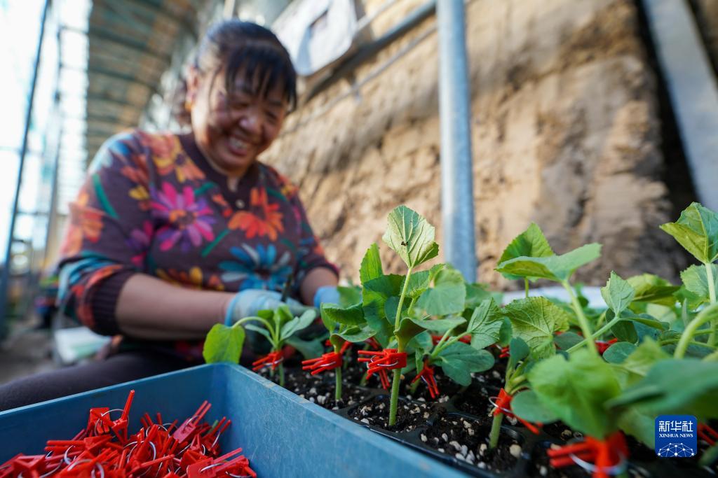 12月5日,河北省樂亭縣一家育苗基地的工人在育苗棚內嫁接秧苗。