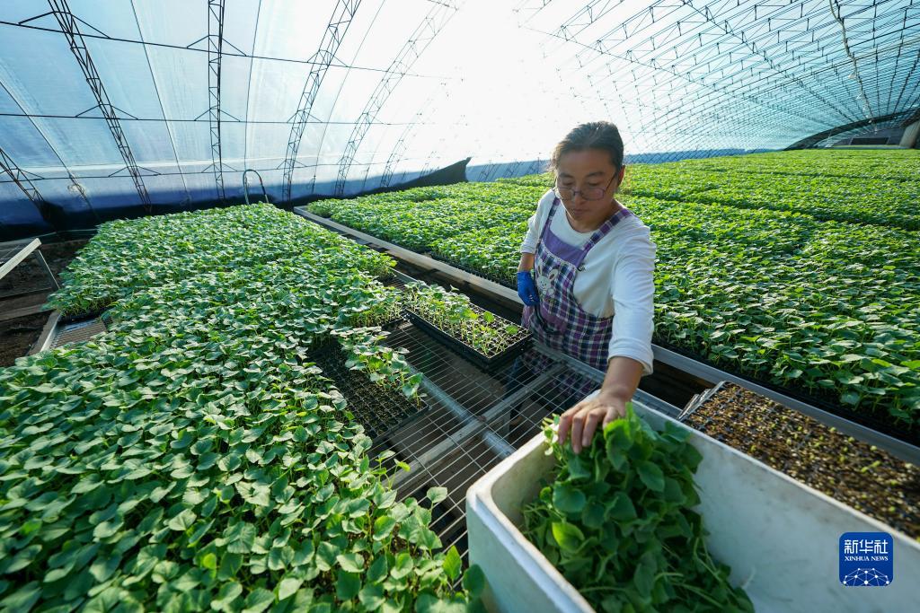 12月5日,河北省樂亭縣一家育苗基地的工人在育苗棚內打理秧苗。