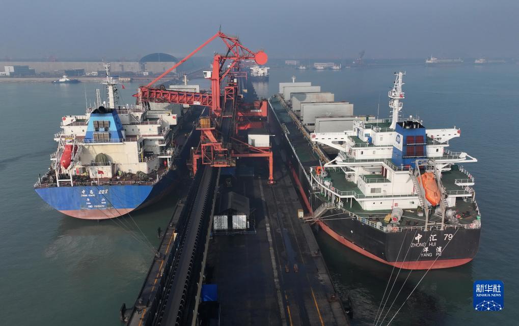 12月5日,兩艘輪船靠泊在唐山港曹妃甸港區國投曹妃甸港口有限公司煤炭碼頭裝貨(無人機照片)。