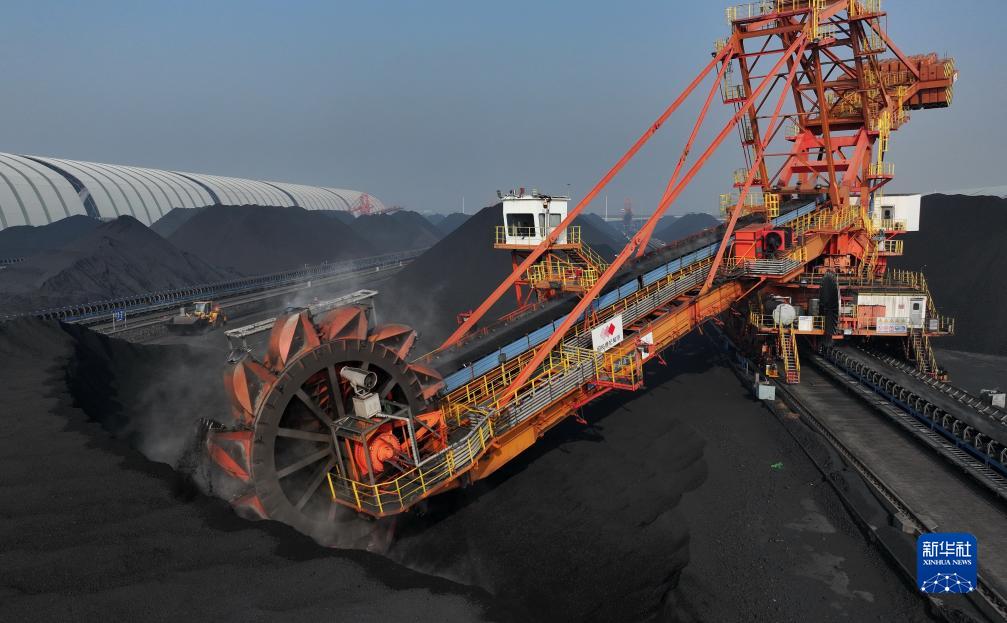 12月5日,工人在唐山港曹妃甸港區國投曹妃甸港口有限公司煤炭堆場操作堆料設備作業(無人機照片)。
