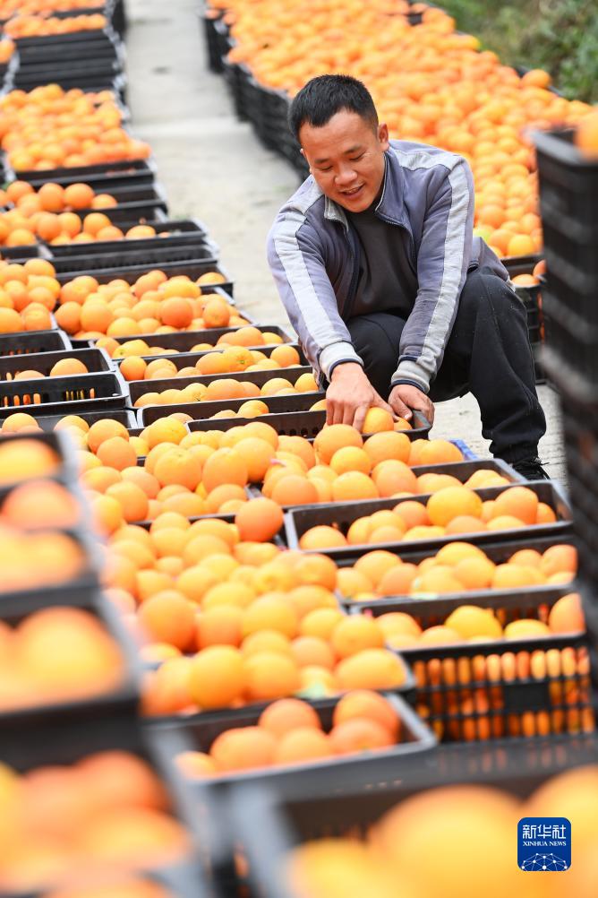 近日,貴州省羅甸縣的臍橙迎來收獲季,農民在臍橙種植基地采摘、搬運臍橙,供應市場。