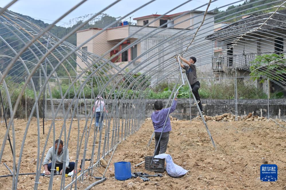 12月5日,在廣西梧州市蒼梧縣木雙鎮粵桂六堡茶產業研學示范園,村民搭建茶苗大棚。
