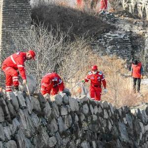 12月5日,志愿者在河北省遵化市興旺寨鎮花椒園村古長城撿拾垃圾雜物。