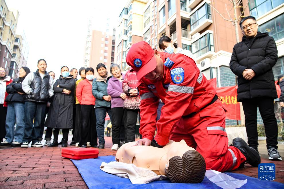 12月5日,在河南省濟源市園丁苑小區廣場,濟源市紅十字應急救援隊的志愿者為市民講解應急救援知識。