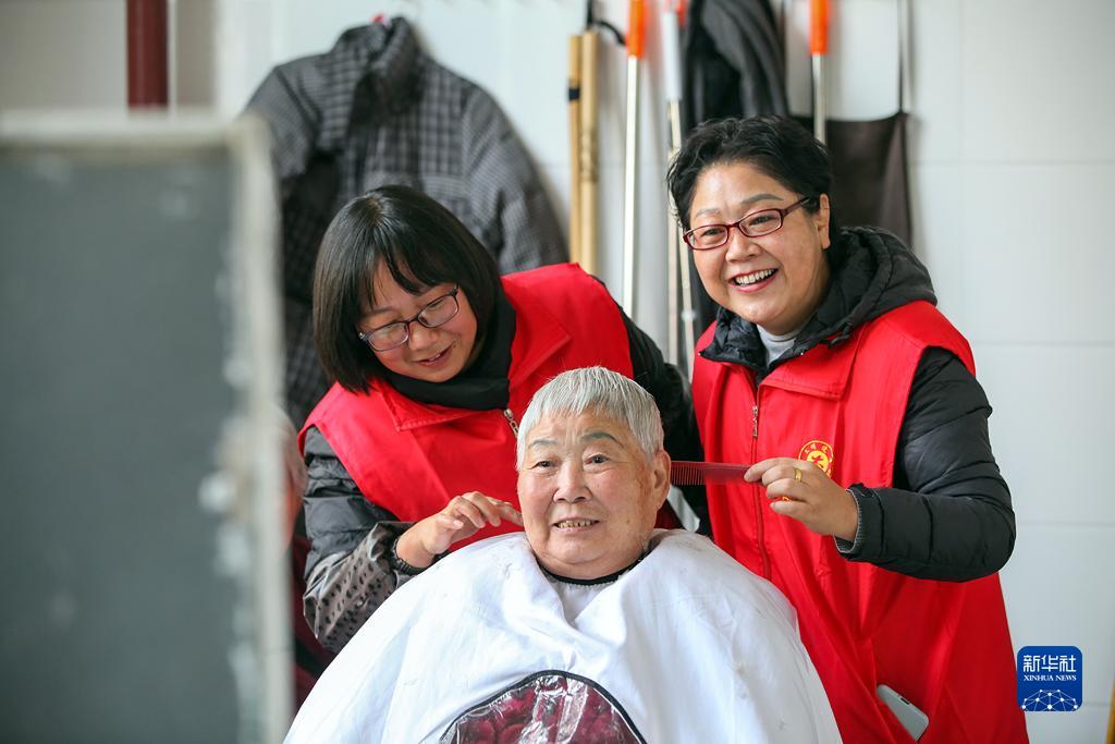 12月5日,在河南省焦作市博愛縣春暉養老院,志愿者為老人理發。