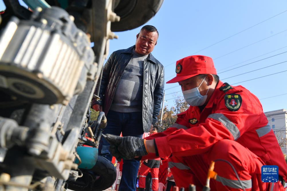 12月5日,河南省夏邑縣雷鋒救援服務隊的志愿者為市民義務修車。