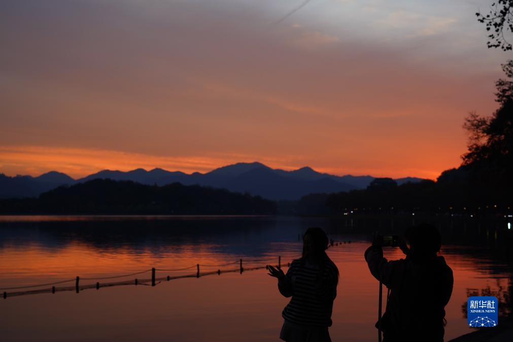 12月5日,游客在杭州西湖拍攝晚霞。