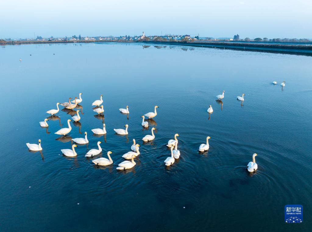 12月5日,一群天鵝在江蘇省興化市里下河國家濕地公園棲息(無人機照片)。