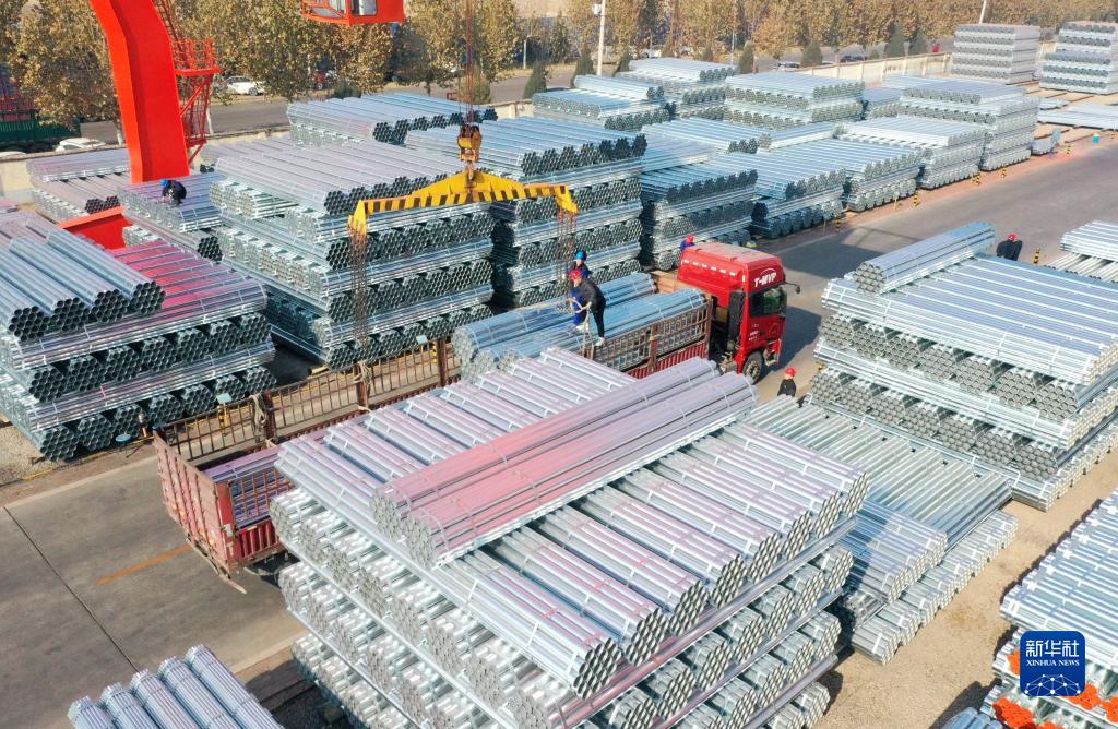 12月5日,成安縣一家制管企業的工作人員將產品裝車外運(無人機照片)。