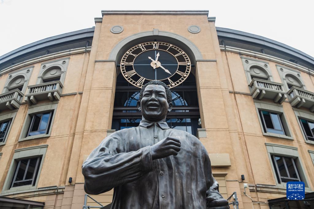 這是12月5日在南非約翰內斯堡曼德拉廣場拍攝的一座曼德拉銅像。