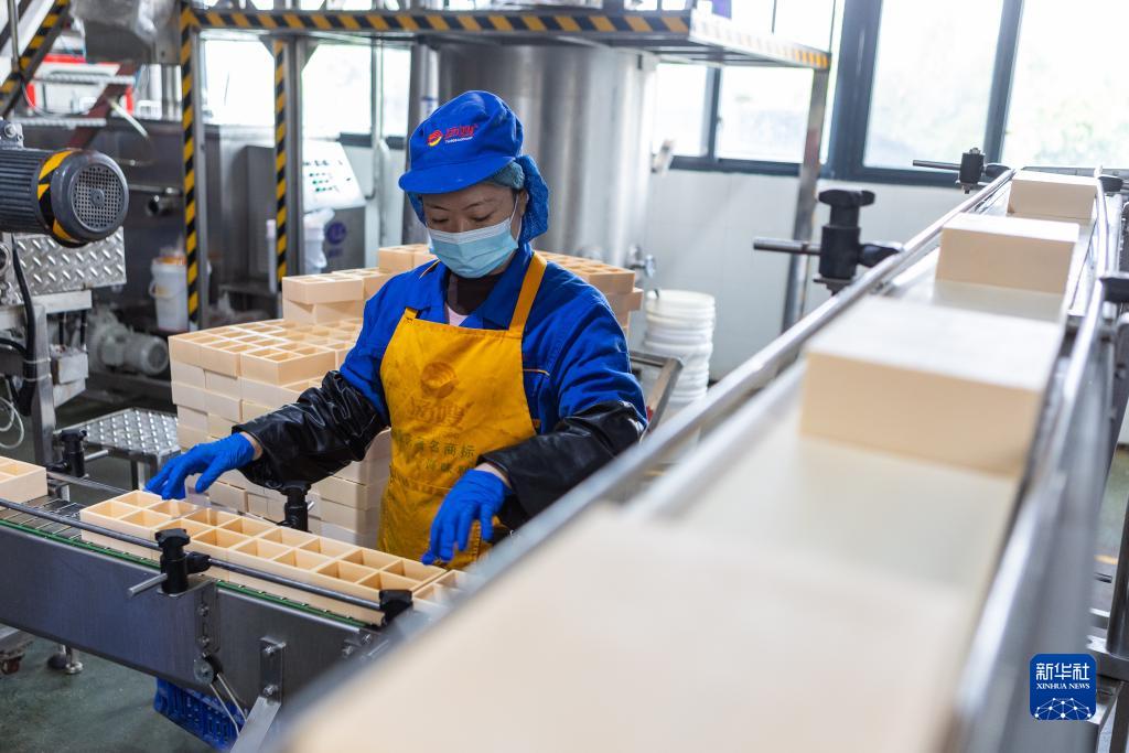 12月5日,在重慶市合川區的重慶湯嫂食品有限公司,工人在全自動灌裝車間投放盛裝火鍋底料的模盒。
