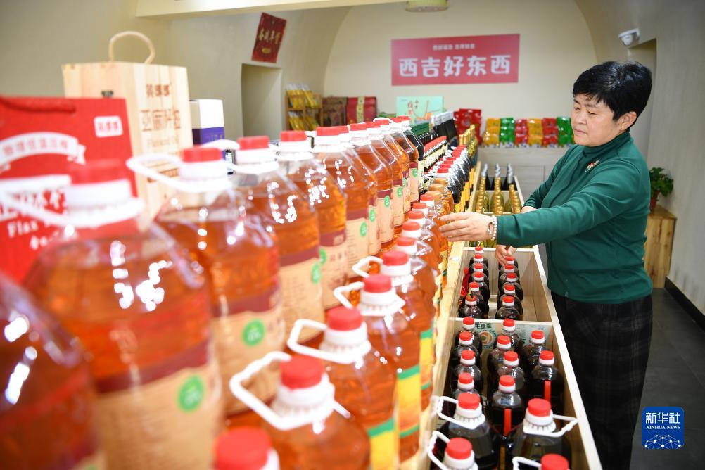 工作人員在西吉縣吉強鎮龍王壩村文旅特色商品店整理當地農特產品(12月1日攝)。