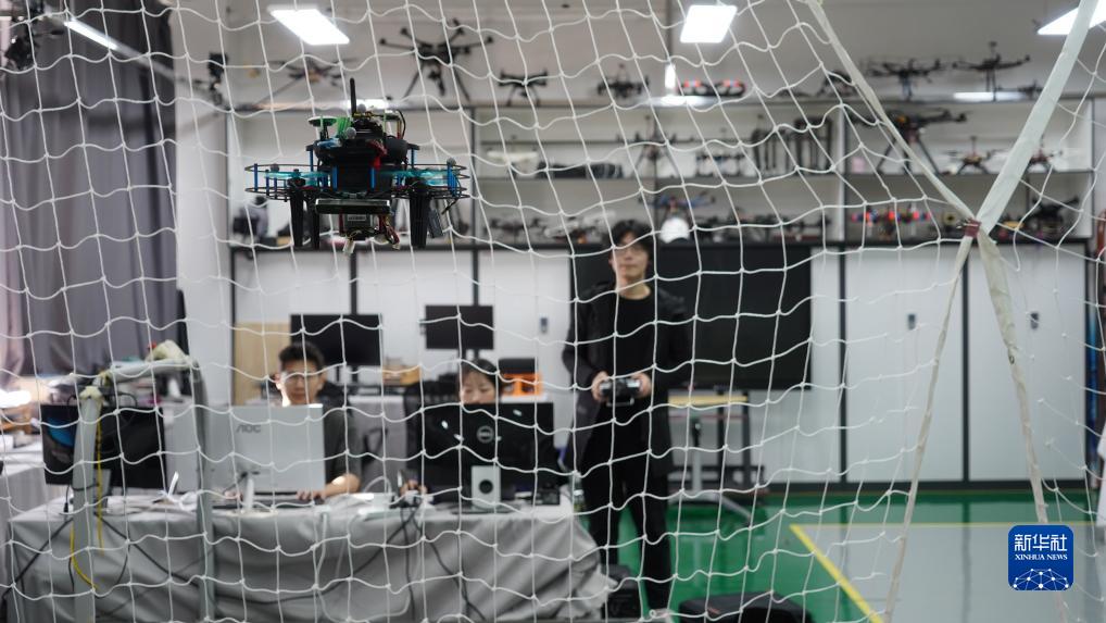 在上海交大機器人研究所的無人系統實驗室,學生在測試無人機性能(11月24日攝)。