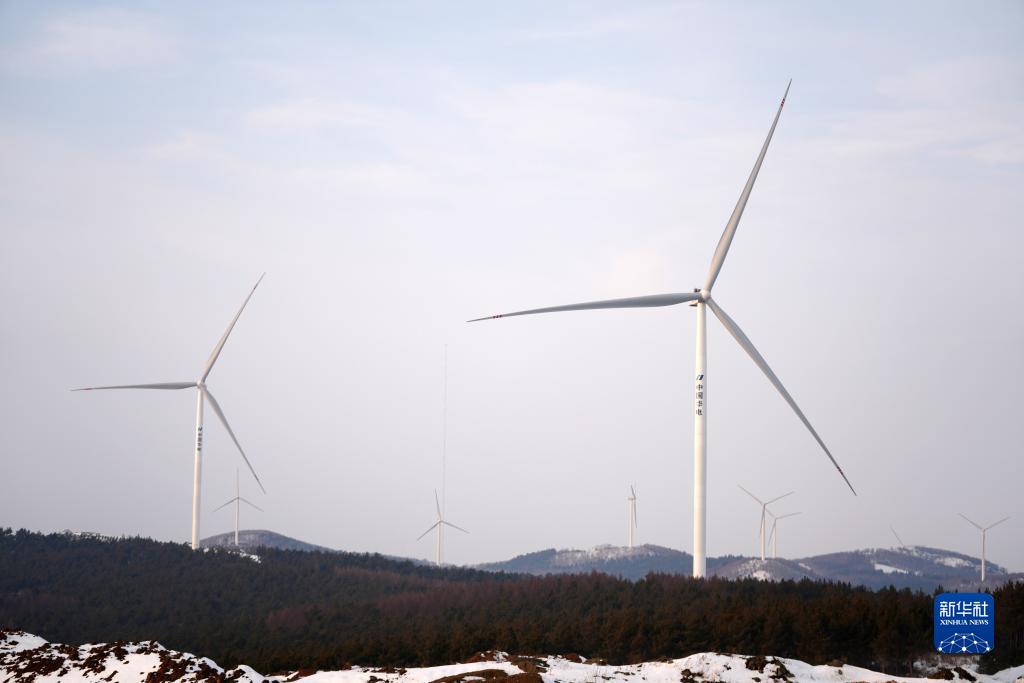12月5日拍攝的華電黑龍江區域哈爾濱依蘭雞冠山風電場四期項目一處運行的風電機組。
