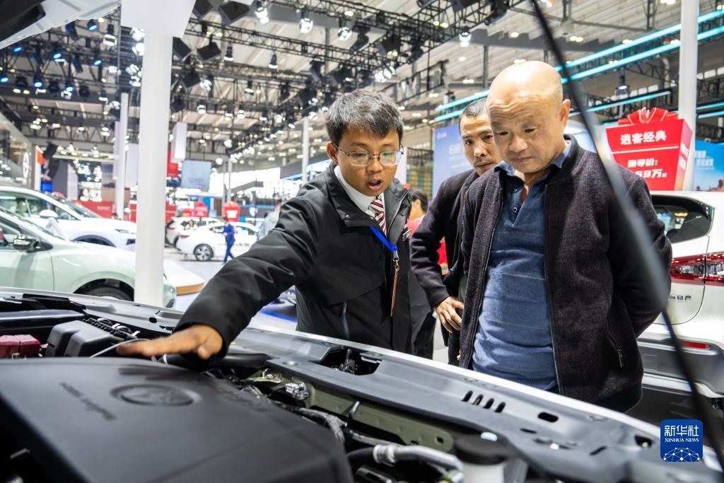 12月6日,在長沙國際會展中心,工作人員(左)為觀眾介紹展車內部構造。