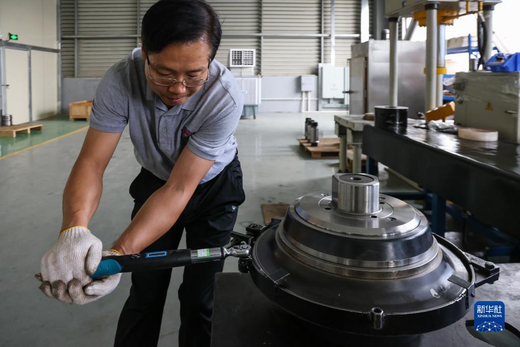 12月6日,中鐵建華南高科的技術員對組裝完成的盾構機滾刀進行扭矩微調。
