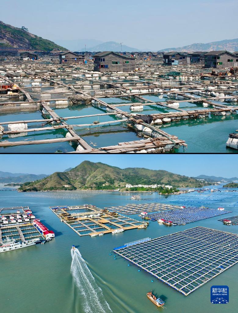 拼版照片:上圖為2007年7月拍攝的福建寧德三都澳海域傳統漁排(資料照片);下圖為2023年11月18日拍攝的福建寧德七星海域升級改造后的漁業養殖區(無人機照片,新華社記者姜克紅攝)。