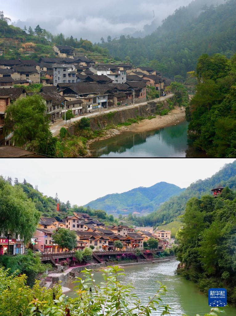 拼板照片:上圖為2014年10月22日拍攝的寧德市壽寧縣下黨鄉下黨村村貌(新華社記者姜克紅攝);下圖為2023年8月5日拍攝的寧德市壽寧縣下黨鄉下黨村新貌(新華社記者林善傳攝)。