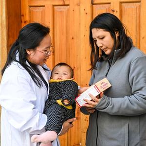 12月6日,在廣西鐘山縣花山瑤族鄉林坪村,唐麗紅(左)給一名婦女講解嬰兒輔食營養包的使用方法。
