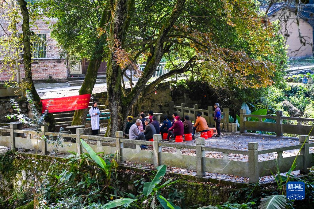 12月6日,在廣西鐘山縣花山瑤族鄉林坪村的一處空地上,唐麗紅(左一)為村民做健康知識宣講。