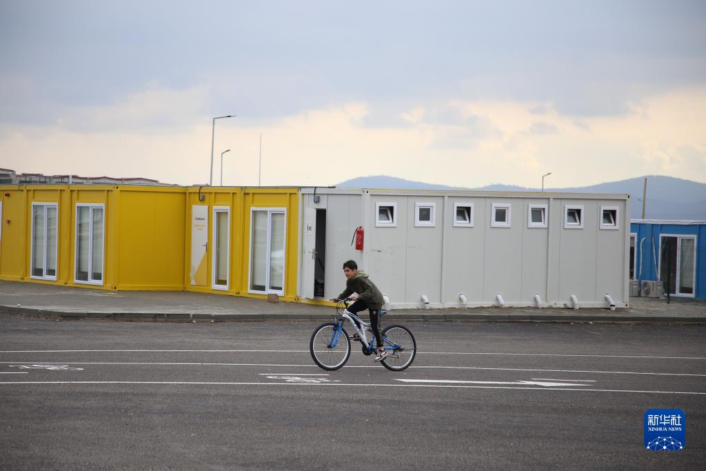 12月6日,在土耳其卡赫拉曼馬拉什,一名男孩在“集裝箱社區”內騎自行車。